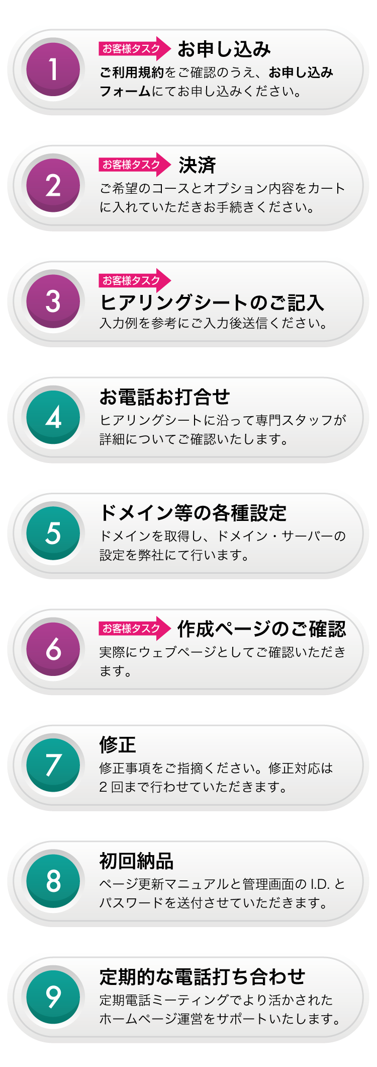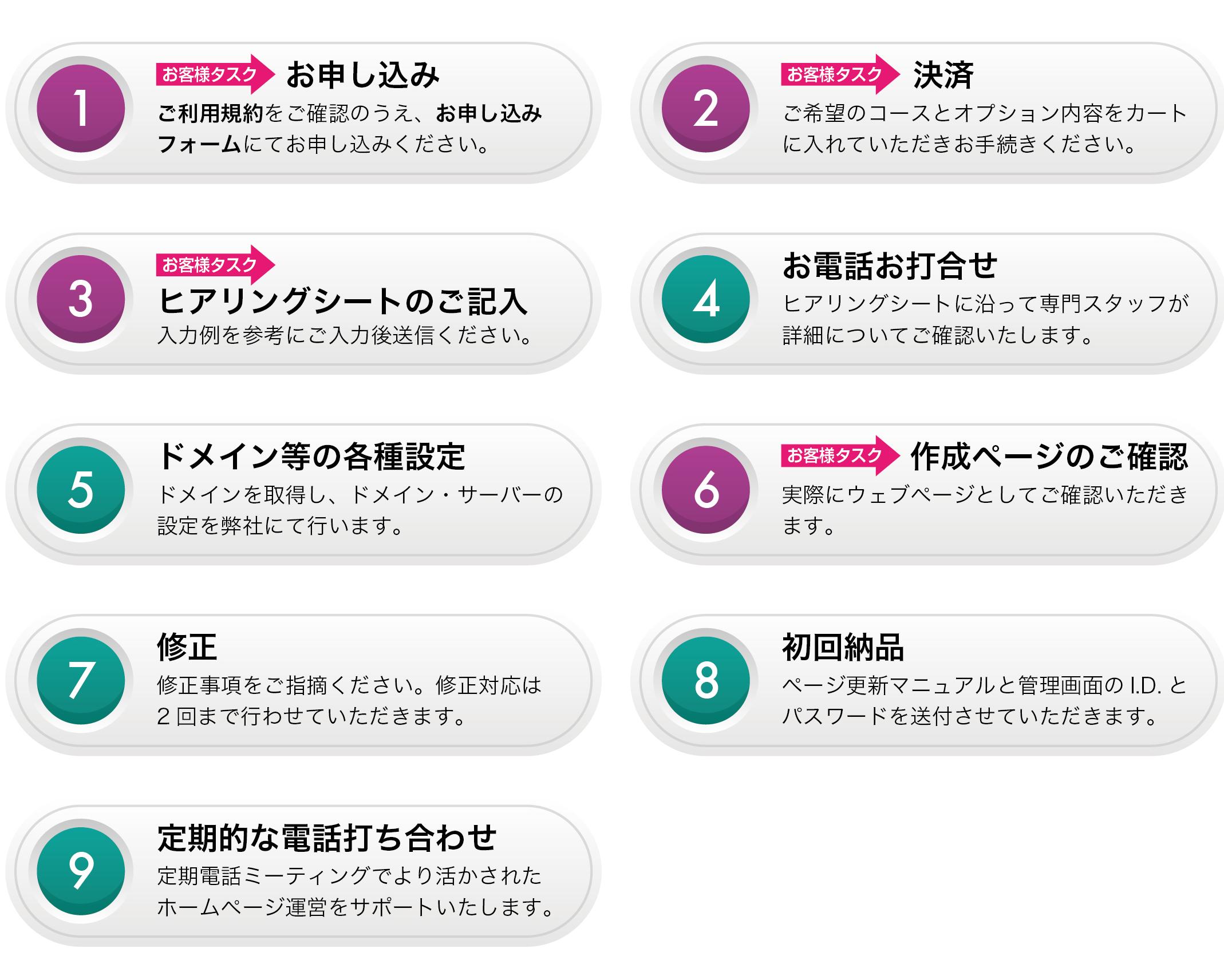 ※全国どこからでも申込可能。定型フォーマットに合わせてヒアリングシートをご記入いただき、サイト制作いたします。