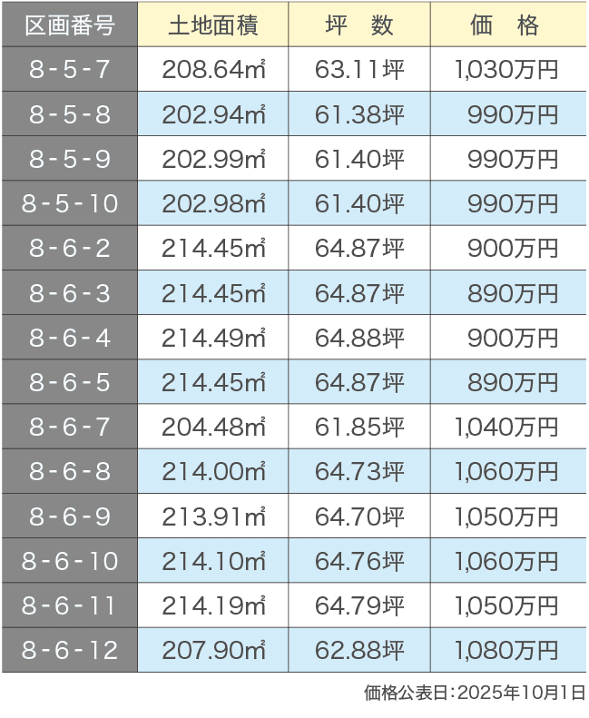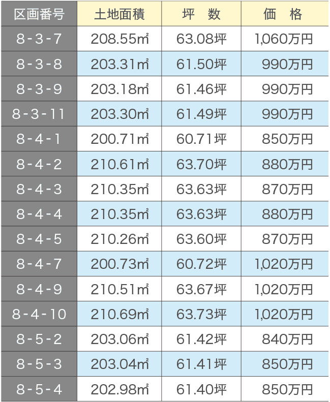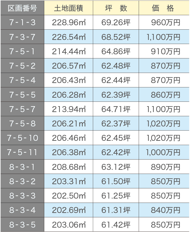 販売区画 土地面積・価格表