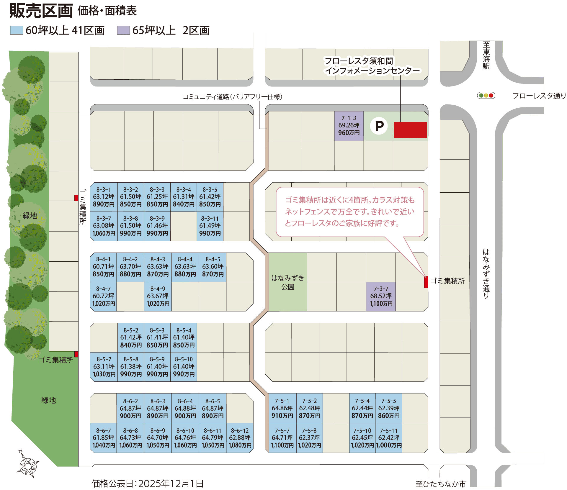 ■全体概要 ●所在地:那珂郡東海村大字須和間2005-3ほか ●交通:JR常磐線「東海駅」下車、茨城交通バス「東海駅東口~フローレスタ須和間・南台・緑ヶ丘循環線」「フローレスタ須和間北」バス停徒歩2〜5分 ●総区画数:689区画 ●都市計画区域:市街化調整区域 ●用途地域:指定なし(建築協定有) ●建ぺい率:50% ●容積率:100% ●地目:宅地 ●開発許可番号:茨城県建指令第90号 許可番号第8号(1997年12月26日)、茨城県建指令第51号 変更許可番号第7号(1999年10月26日)、茨城県建指令第32号 変更許可番号第4号(2006年12月11日)、東海村指令第492号 変更許可番号第2号(2013年7月12日)、東海村指令第813号 変更許可番号第1号(2014年8月11日)、東海村指令第365号 変更許可番号第1号(2015年4月22日)、東海村指令第1711号 変更許可番号第1号(2021年12月3日) ●検査済証番号:第5・6・12工区第12号(2015年6月1日)、第7・8工区第62号(2022年1月28日) ●道路:幹線道路16mアスファルト舗装、区画道路6mアスファルト舗装(一部インターロッキング舗装)、緑道2mインターロッキング舗装 ●私道負担:なし ●設備:電気/東京電力、飲用水/村営水道、ガス/プロパン(集中供給方式)、汚水・雑排水/公共下水道、雨水/調整池へ放流 ●管理費等:附属施設維持管理基金100,000円、ケーブルテレビ個別引込工事費44,000円、水道加入金183,600円(7工区の一部)、187,000円(7・8工区)、附属施設運営費〈タウンセキュリティ費・JWAY基本視聴料、除草作業費など〉4,000円(月額) ●手付金保全:(株)常陽銀行 ●所属団体:(公社)茨城県宅地建物取引業協会